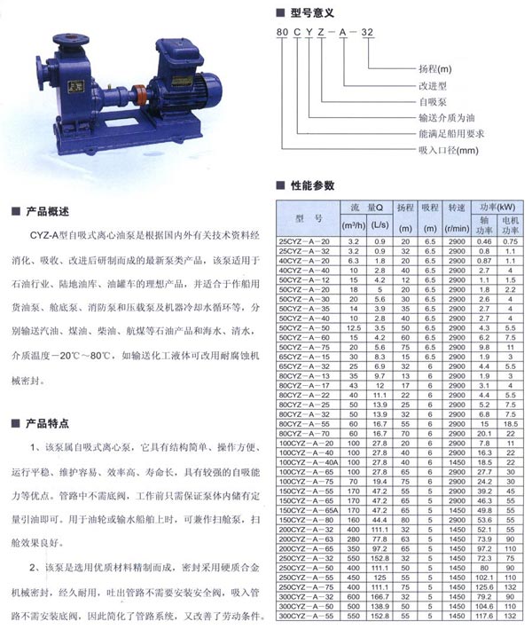 CYZ自吸離心油泵是根據國內外有關技術資料經消化、吸收、改進后研制而成的新泵類產品,該泵適用于石油行業、陸地油庫、油罐車的理想產品,并適合于作船用貨油泵、艙底泵、消防泵和壓載泵及機器冷卻水循環等,分別輸送汽油、煤油、柴油、航煤等石油產品和海水、清水,介質溫度-20℃-80℃,如輸送化工液體可改用耐腐蝕機械密封。